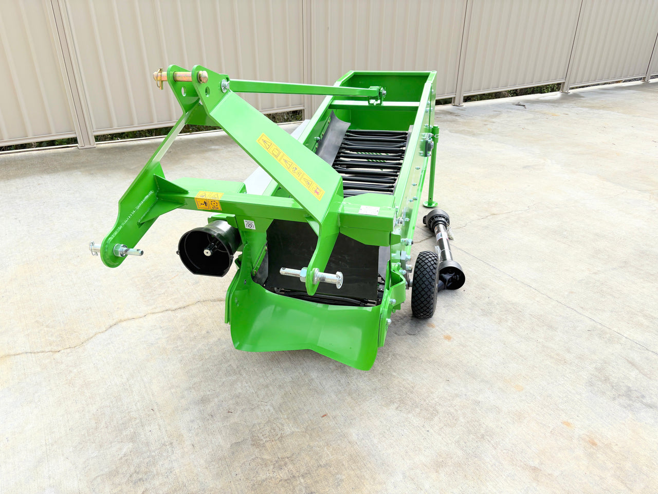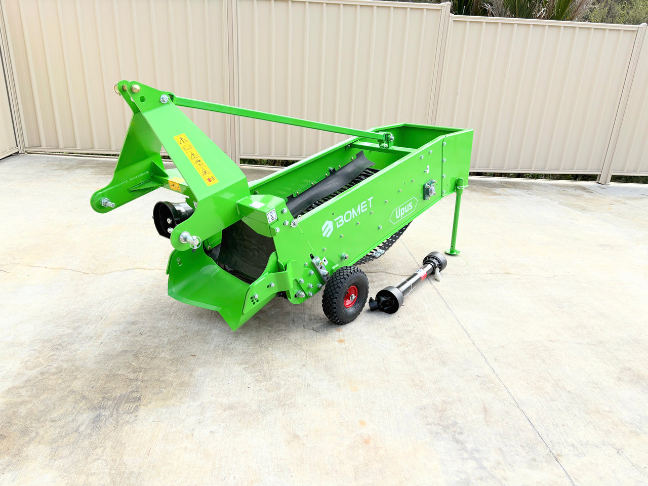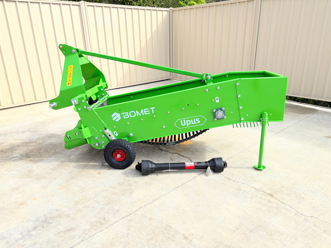 The Bomet Upus is a one-row machine mounted on the three-point linkage and driven by the tractor power take-off shaft. The digger is fitted with dual category 1 and 2 lower pins.